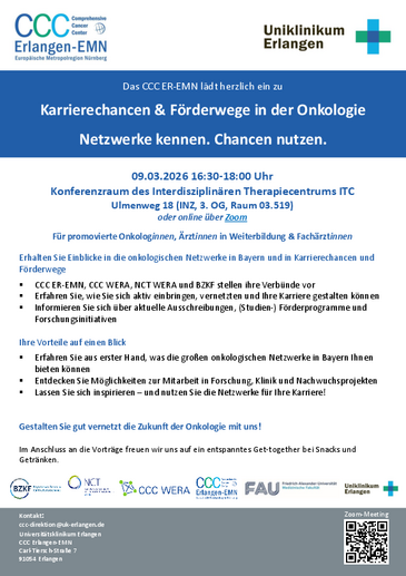 Am 9. März 2026 lud das CCC Erlangen-EMN zur Veranstaltung „Karrierechancen & Förderwege in der Onkologie – Netzwerke kennen. Chancen nutzen.“ in das Interdisziplinäre Therapiecentrum (ITC) in Erlangen ein. Zahlreiche interessierte promovierte Onkologinnen, Ärztinnen in Weiterbildung sowie Fachärztinnen nahmen vor Ort und online teil, um sich über Karrierewege und Fördermöglichkeiten in der onkologischen Forschung und Versorgung zu informieren.